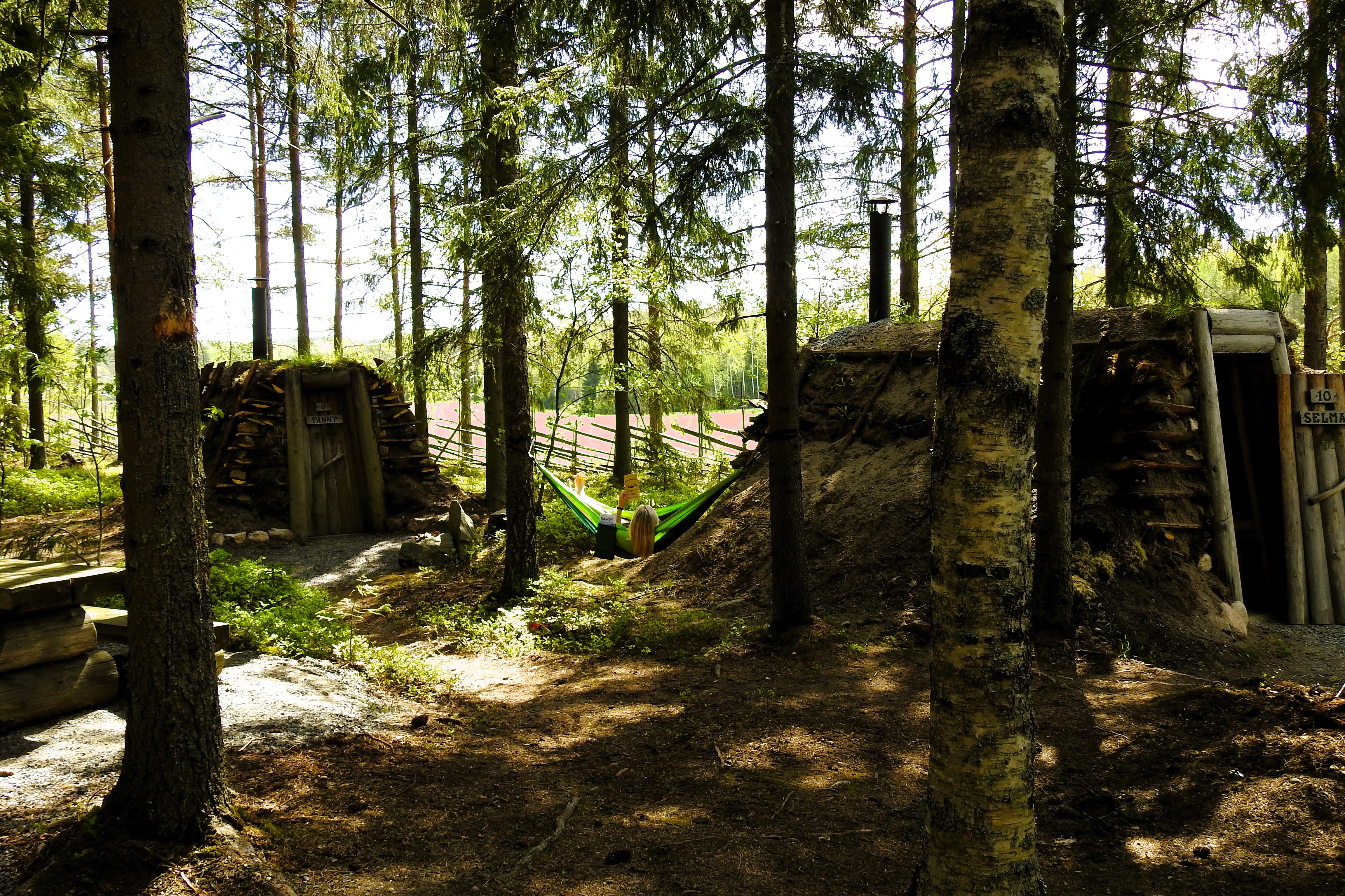 Mökkikylä on yhdistelmä miilunpolttajan majoja ja pieniä hirsimökkejä ilman sähköä, raikasta juomavettää saat pumppaamalla kaivosta.