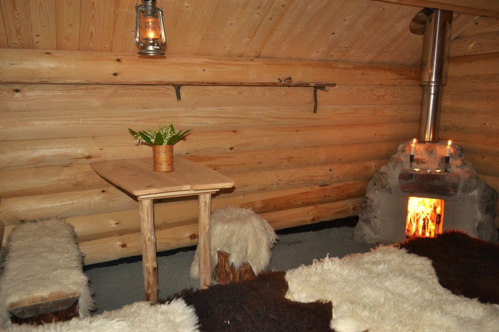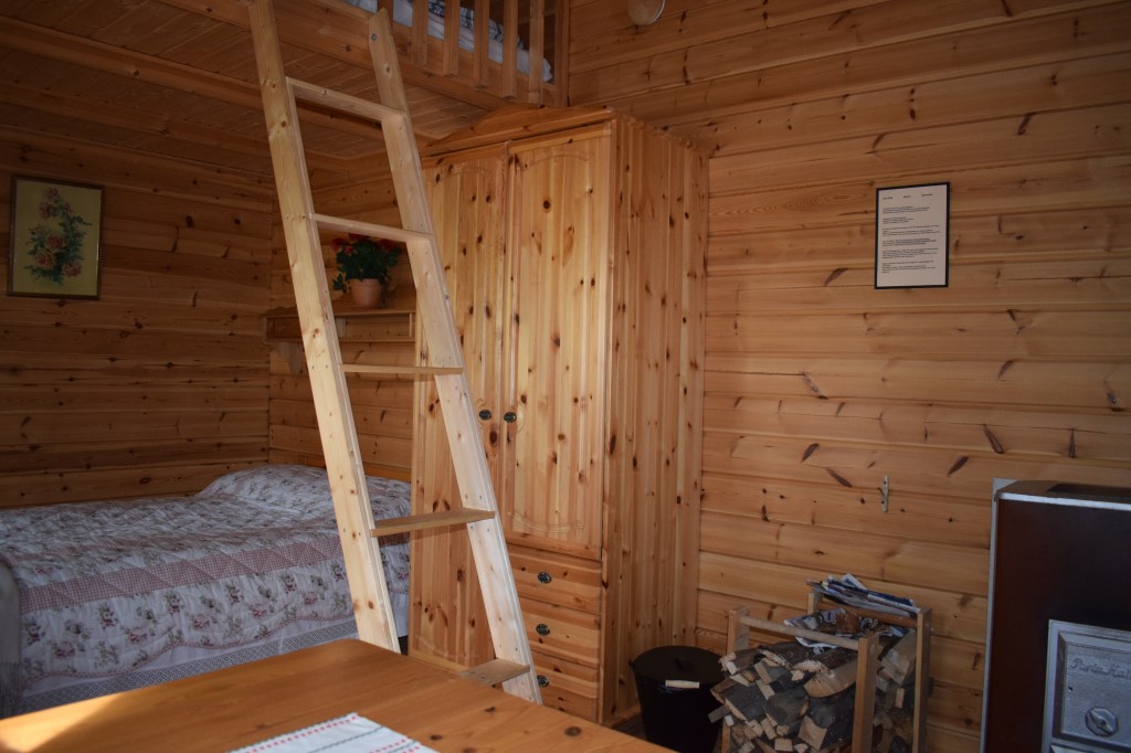 Timmerstugan är mysig och enkelt inredd med två sängar, bord och pallar. Stugan värms genom att du hugger små ved och eldar själv i spisen.